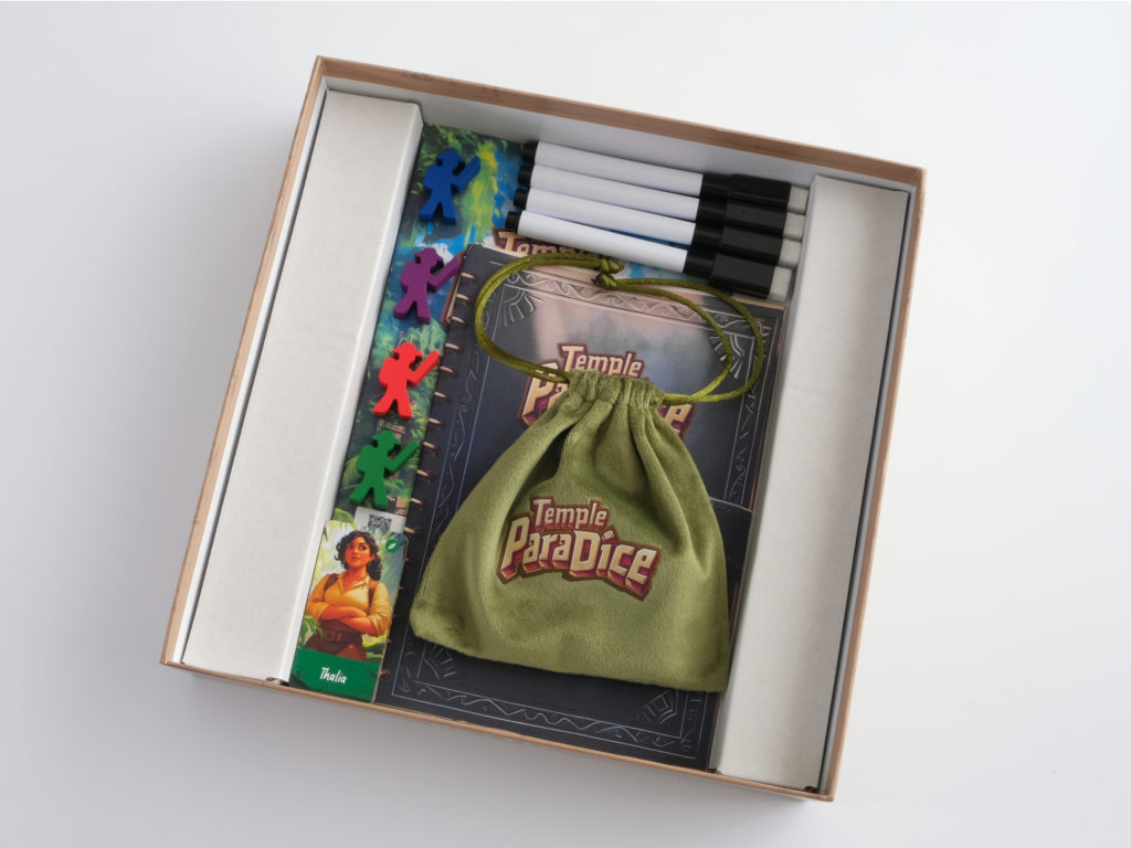 Temple ParaDice est un jeu stratégique de type « roll & write » avec de l’interaction entre les joueurs et de la prise de risque. Formez votre équipage pour explorer l’île mystérieuse de LOOT et récupérer des trésors protégés par une malédiction. Chaque tour, lancez les dés, explorez différents lieux pour récolter des richesses, construisez des barques pour sécuriser vos trésors et utilisez vos compétences d’adrénaline au bon moment pour vous aider dans votre exploration et vous permettre d’interagir avec les autres joueurs, voire même d’influencer leur exploration. Attention : chaque jour rapproche le moment où l’île vous piégera définitivement avec la malédiction du dieu Ah Puch.