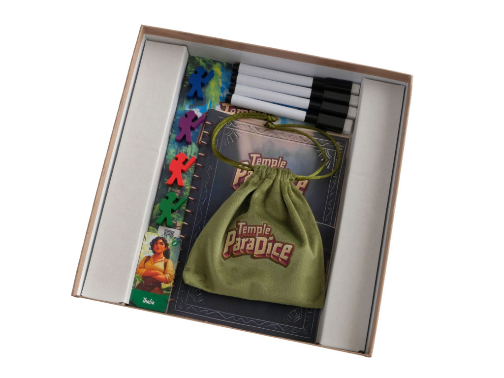 Temple ParaDice est un jeu stratégique de type « roll & write » avec de l’interaction entre les joueurs et de la prise de risque. Formez votre équipage pour explorer l’île mystérieuse de LOOT et récupérer des trésors protégés par une malédiction. Chaque tour, lancez les dés, explorez différents lieux pour récolter des richesses, construisez des barques pour sécuriser vos trésors et utilisez vos compétences d’adrénaline au bon moment pour vous aider dans votre exploration et vous permettre d’interagir avec les autres joueurs, voire même d’influencer leur exploration. Attention : chaque jour rapproche le moment où l’île vous piégera définitivement avec la malédiction du dieu Ah Puch.